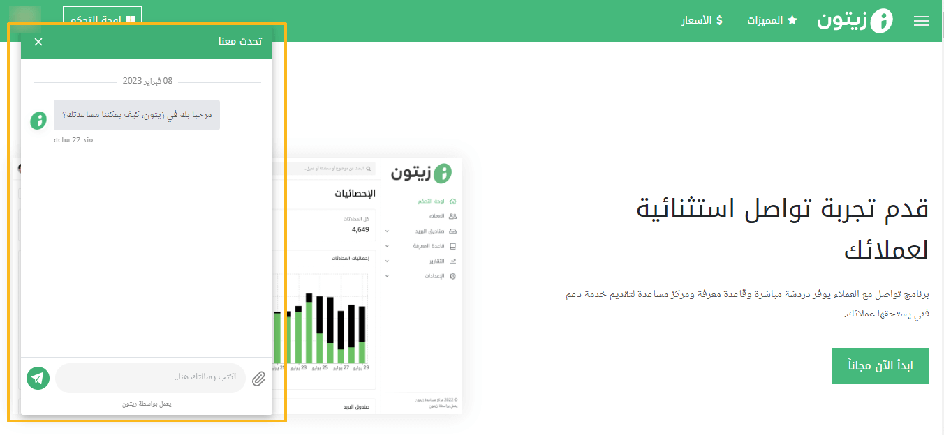 - توجّه الآن إلى زيتون للتسجيل في المنصة وإنشاء دردشة مباشرة مجانية، من خلال الذهاب إلى الصفحة الرئيسية ثم الضغط على «ابدأ الآن مجانًا».
