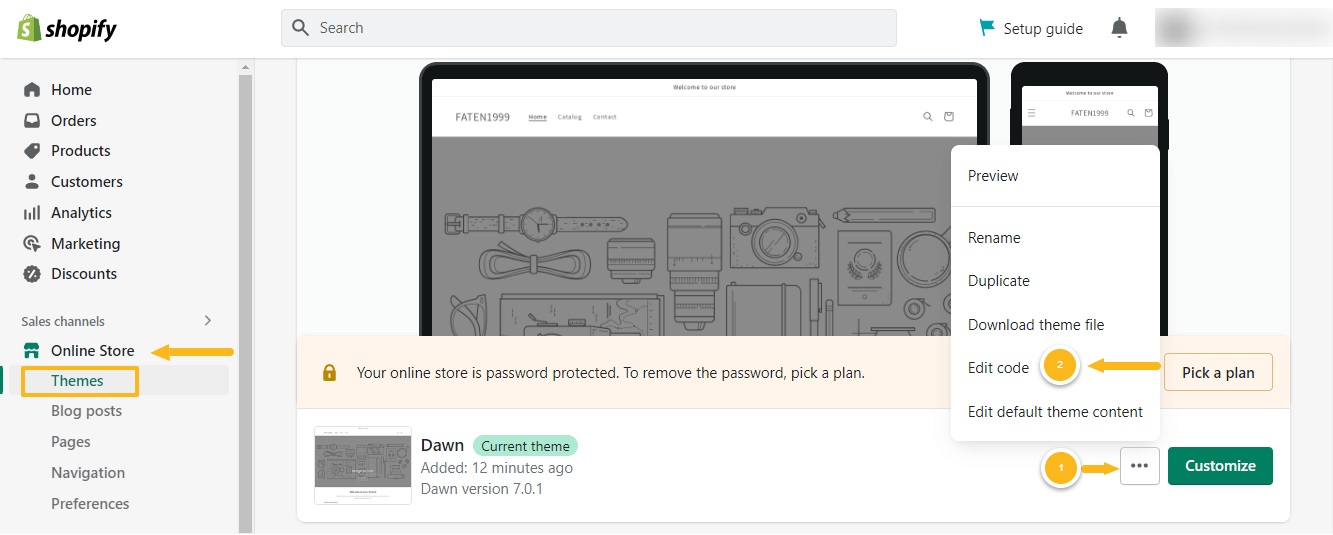 - انتقل إلى «Themes»، ونفّذ ما يلي في السمة التي ترغب بتعيينها في متجرك والتعديل عليها: